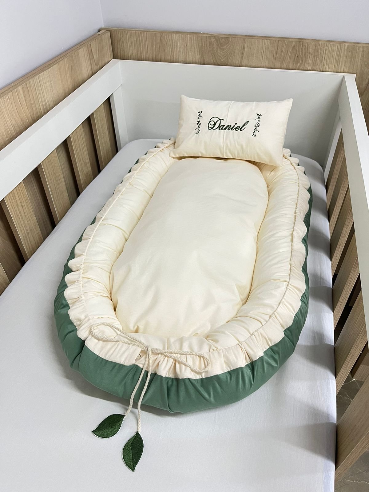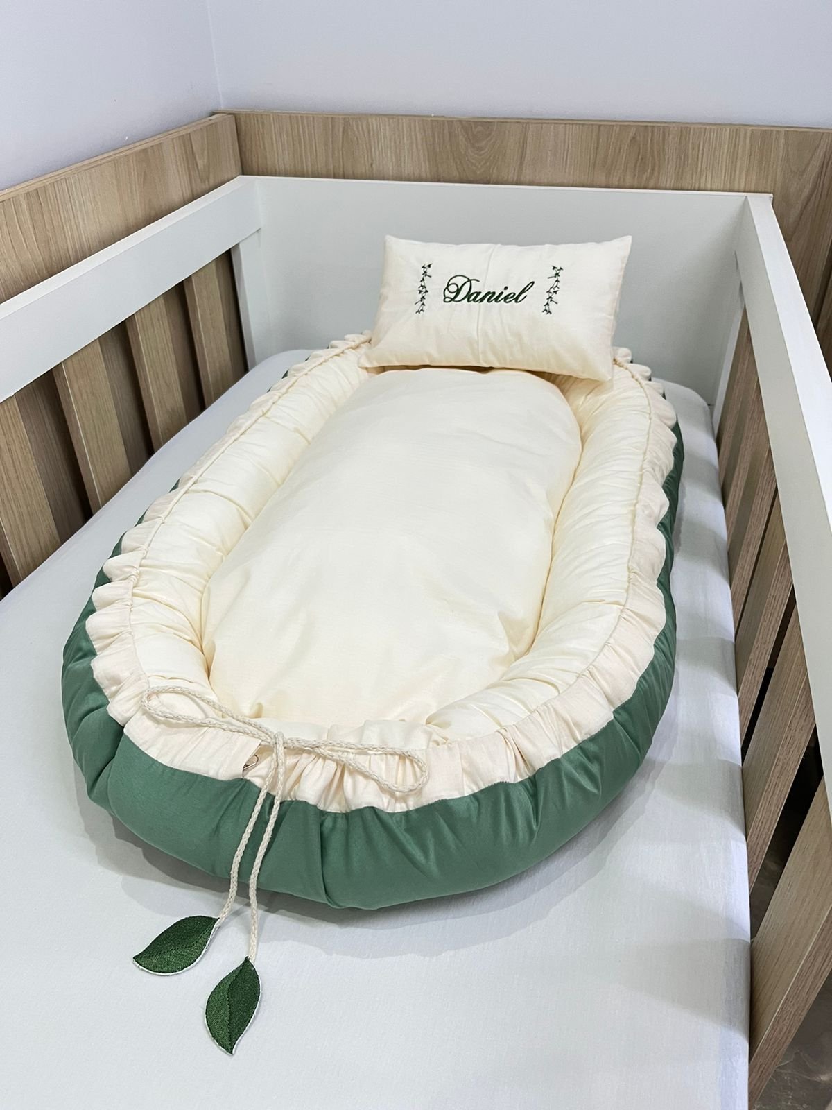 Ninho redutor de berço branco e cinza.
